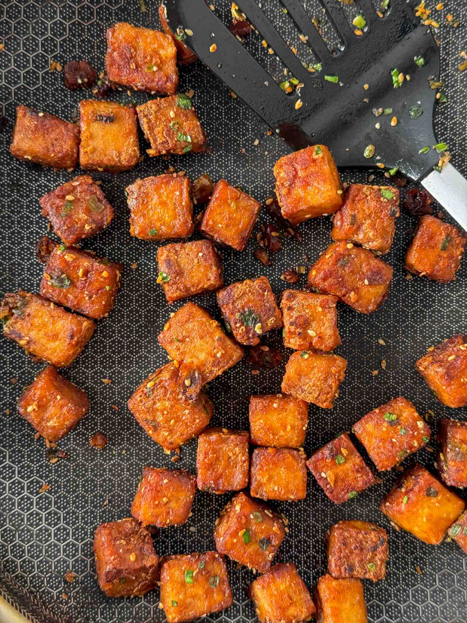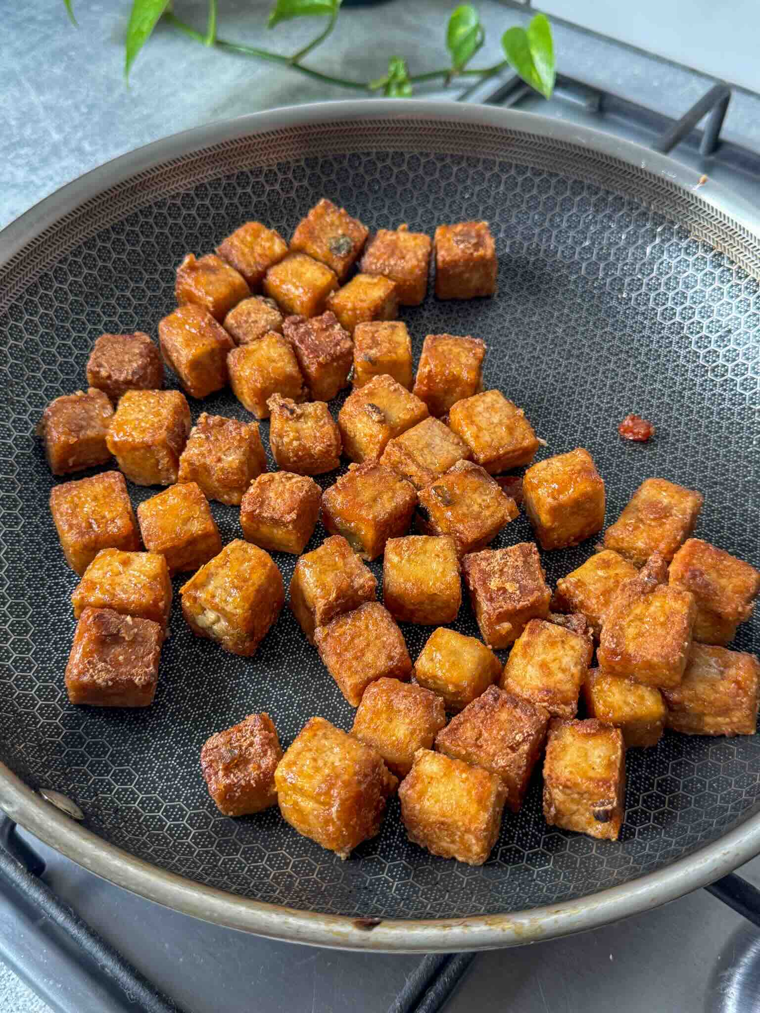 Finally, a light coating of cornflour and a generous pan-fry transforms the tofu into crisp, golden cubes that stay tender on the inside and punchy on the outside.