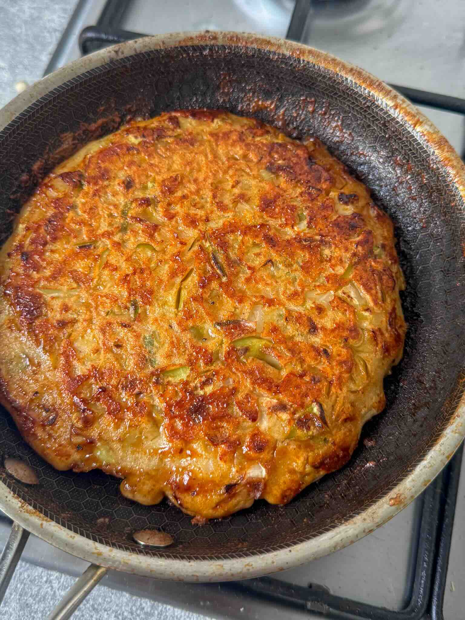 Carefully flip the okonomiyaki. Cook uncovered for another 4–5 minutes, until golden and cooked through.