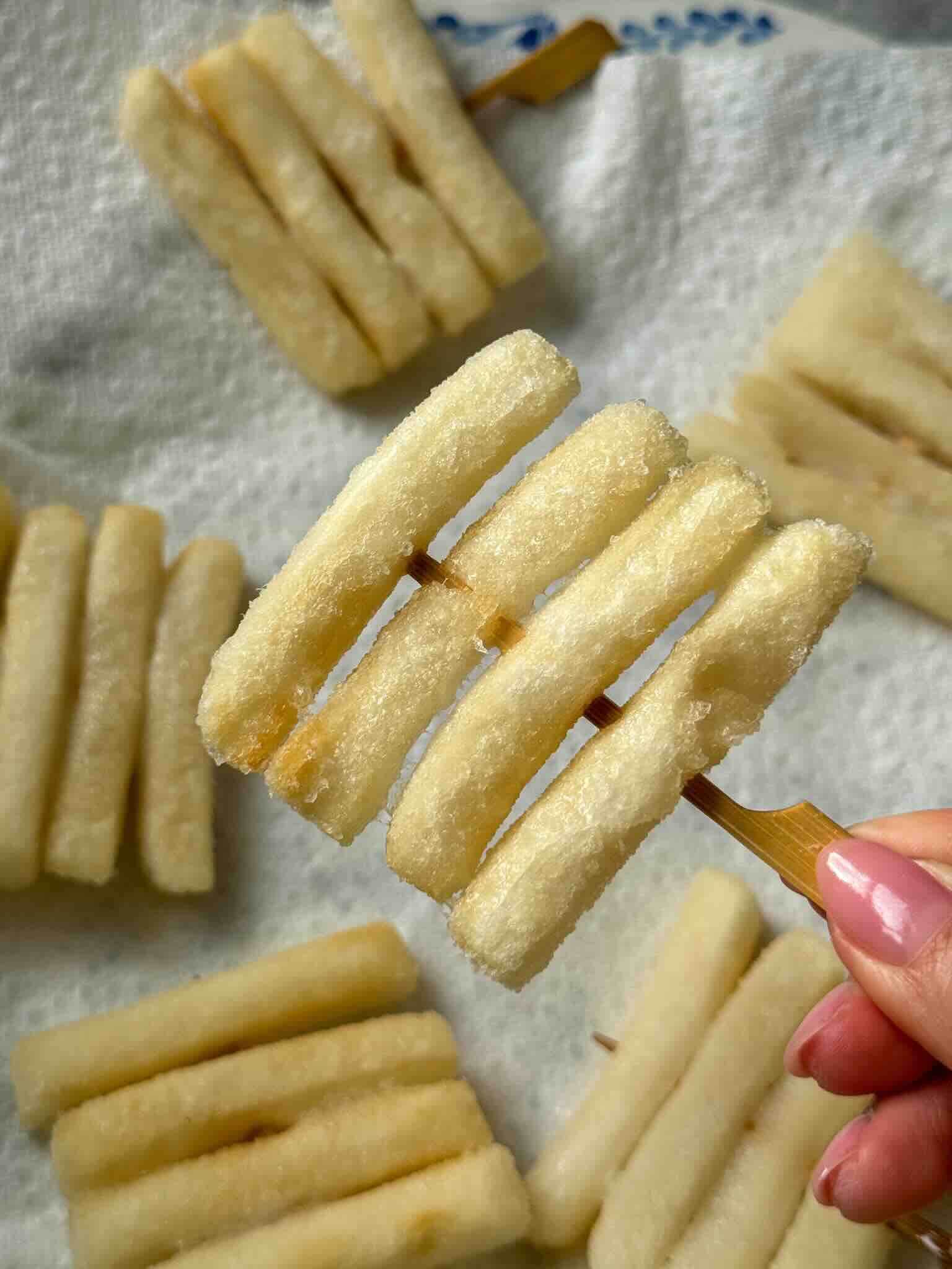 Drain and rinse under cold water to lock in that chewy texture. Pat them really dry - this is key to avoid splattering when frying.