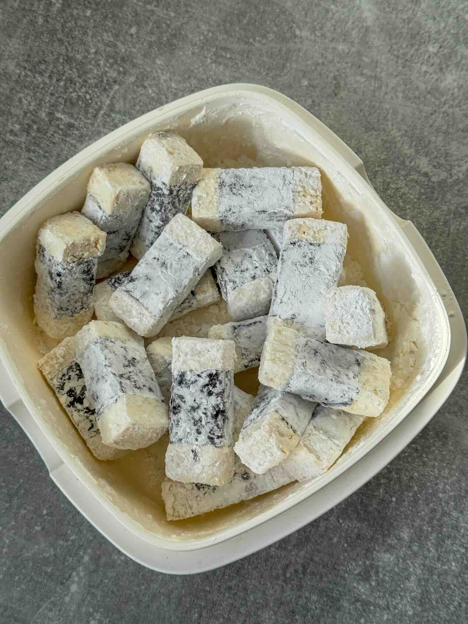 Toss the wrapped tofu sticks in cornflour, making sure all sides are evenly coated.